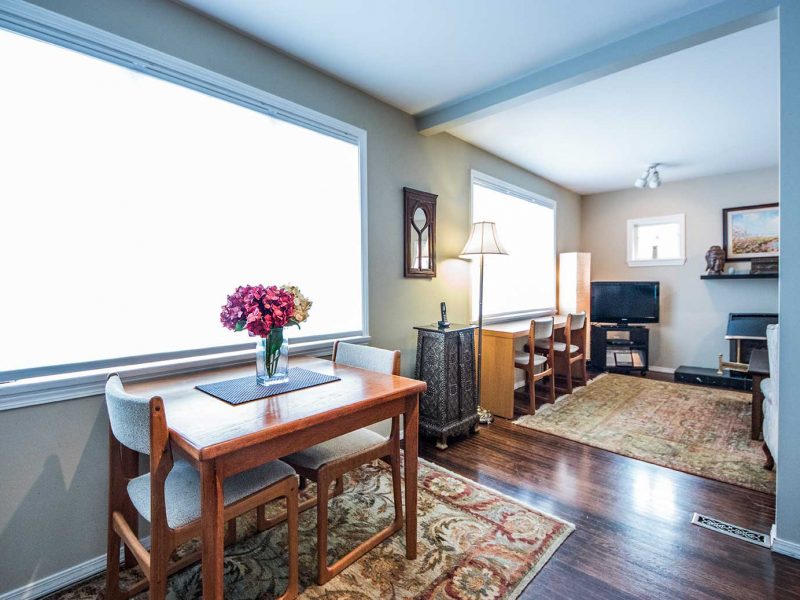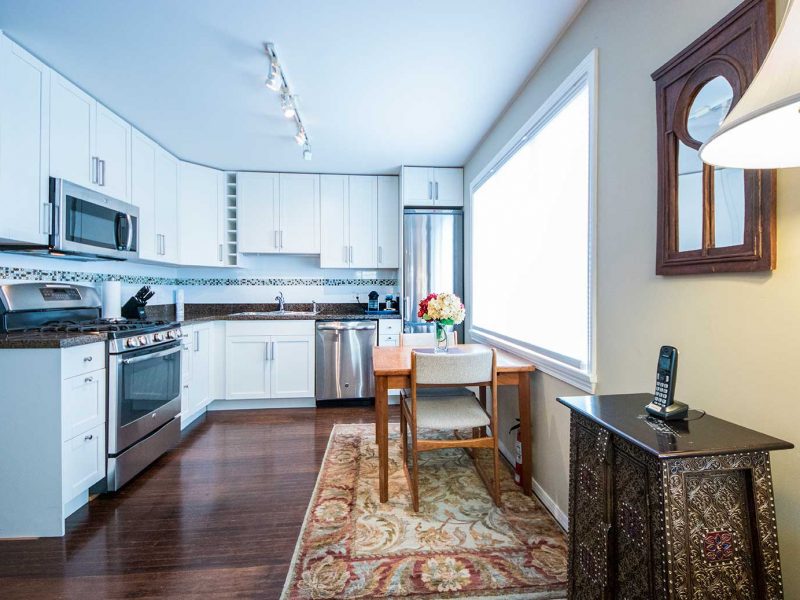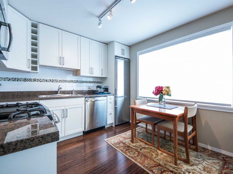 The kitchen is brand new with granite countertops, double stainless steel sink and stainless steel appliances. It is fully equipped including dishwasher, gas stove and all amenities plus a dining table for 4. This suite is most suitable to 1 or 2 persons.