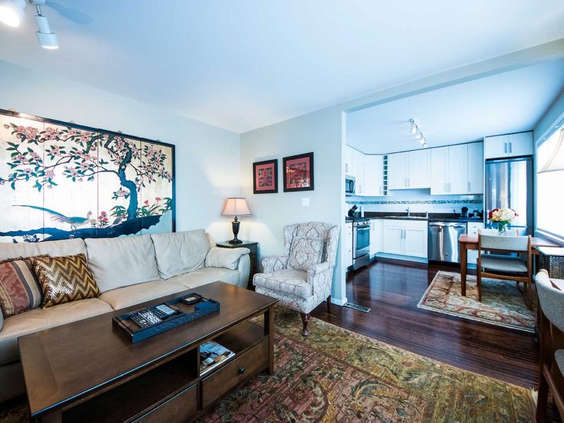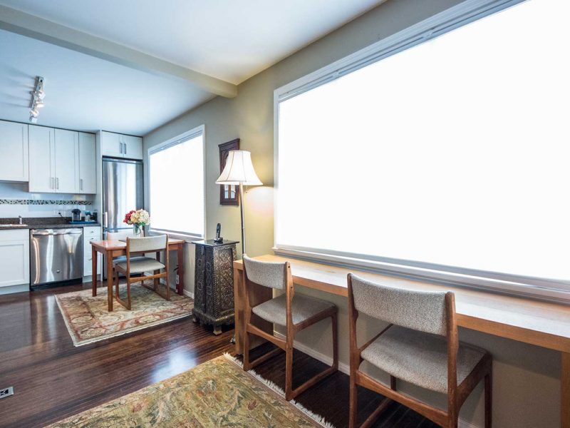 A sensational, bright south-facing one bedroom apartment with hardwood floors and gas fireplace, that is ideal for two persons wanting to escape to a pied-de-terre and enjoy all Vancouver has to offer. The living room features a beautiful Natuzzi Italian leather sofa, large leather ottoman, exquisite wool carpetting, gas fireplace, antique leaded glass windows and a 42 inch flat screen TV with full cable service.
