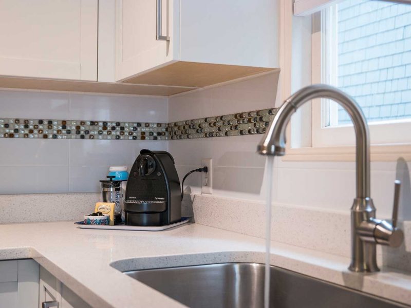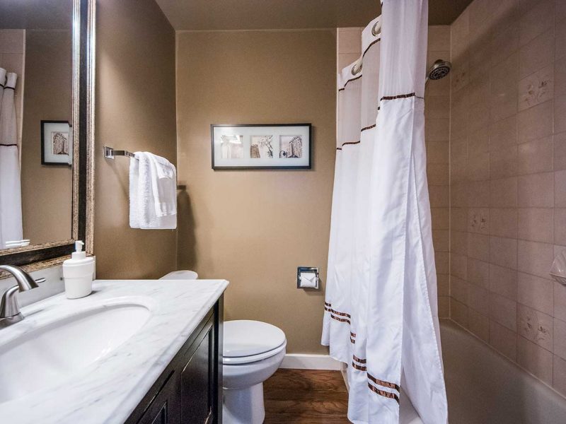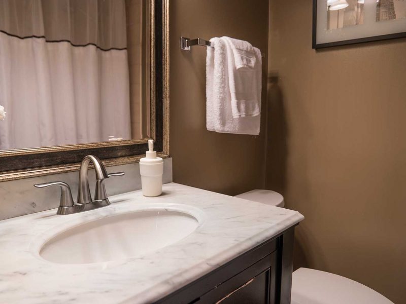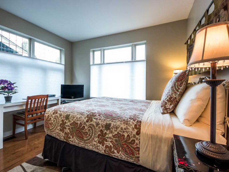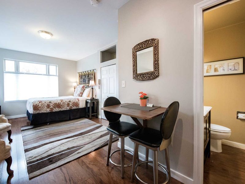 The suite has a queen size bed with soft 400 thread count sheets and Pottery Barn duvet covers. The suite also features 2 large comfortable lounge chairs and electric wall mounted fireplace to keep you toasty warm in winter. It also has a computer station with a flat screen TV and full cable TV service. This suite is most suitable for 1 or 2 persons.