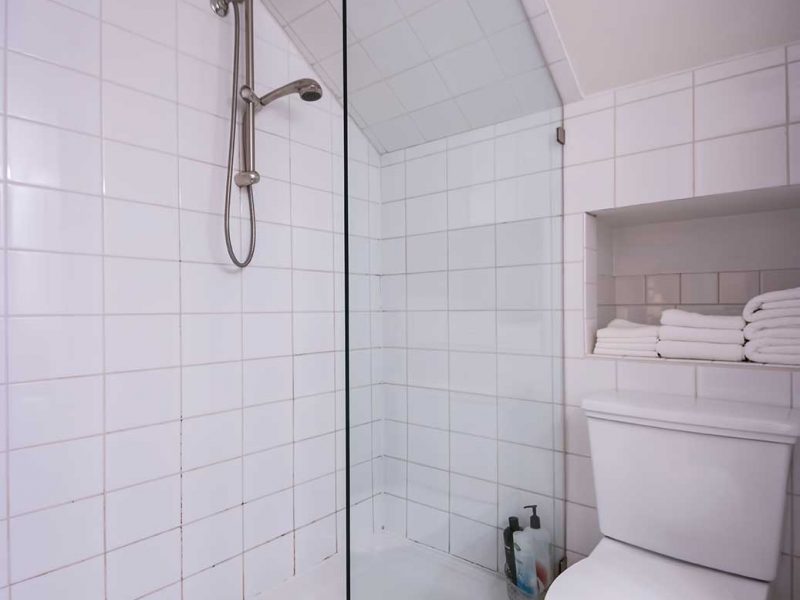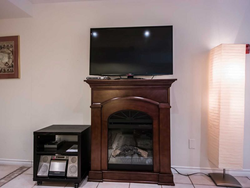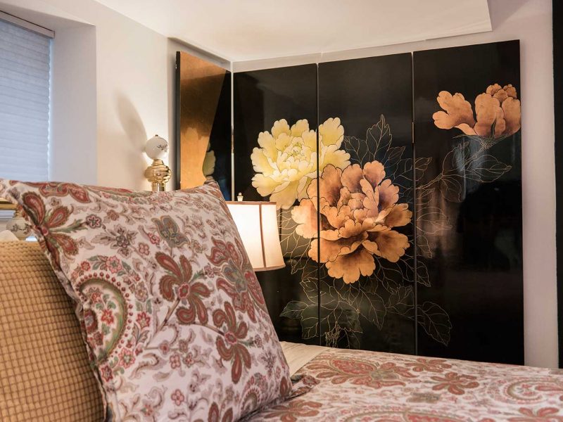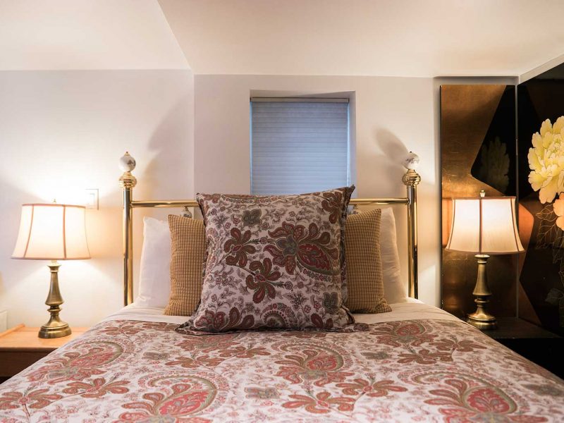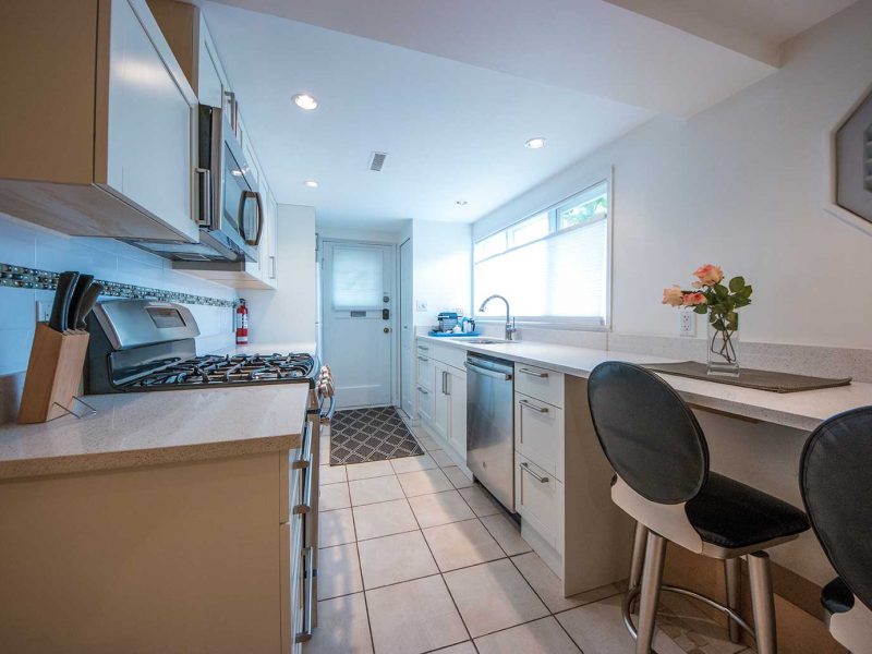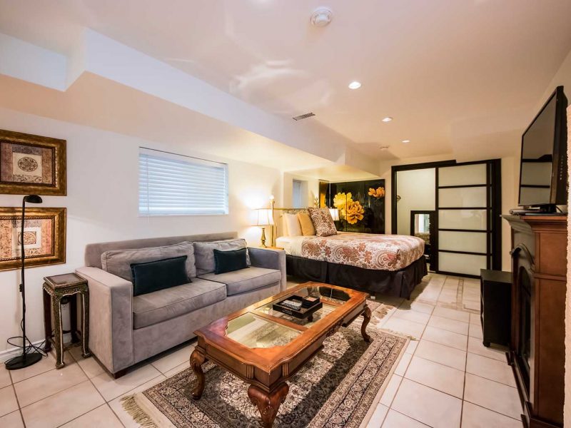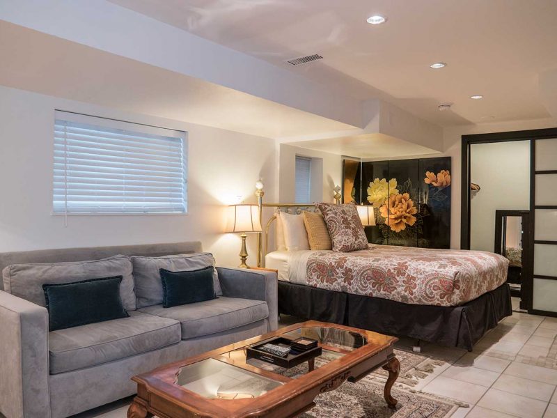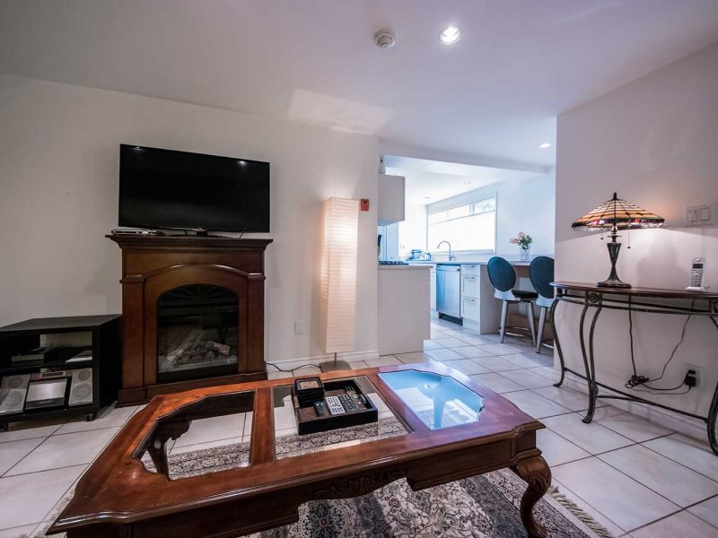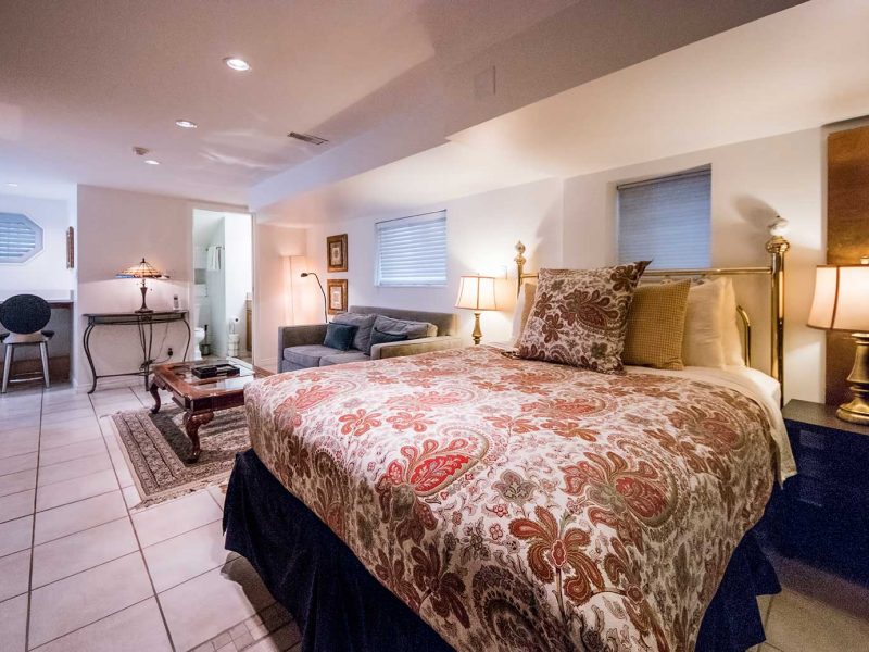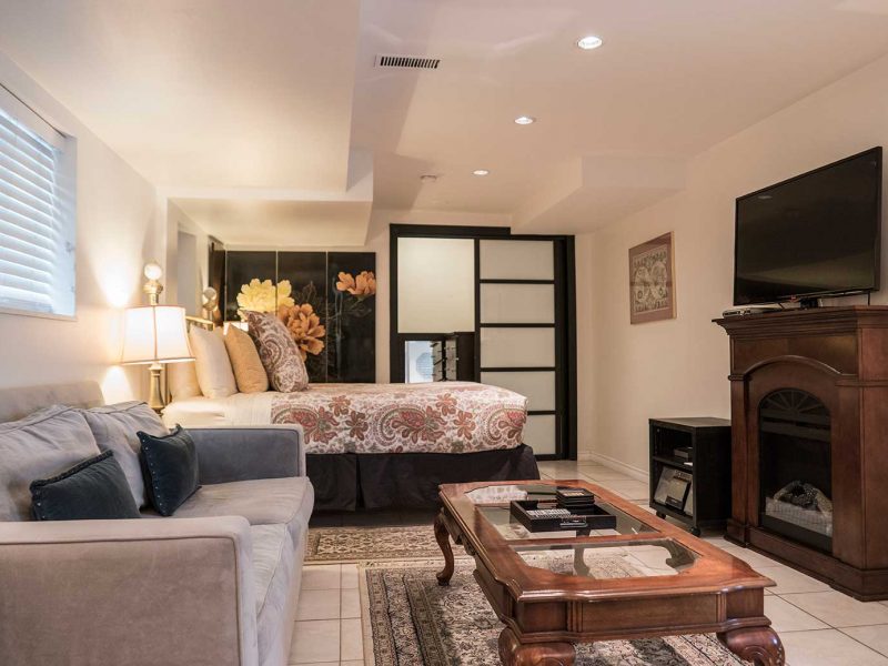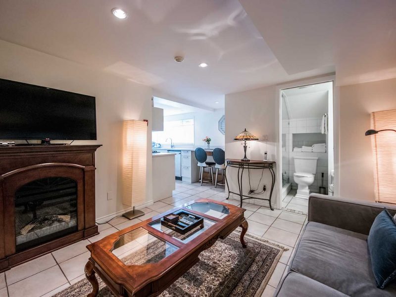 No stairs to climb and separate entrance, this studio suite is conveniently located on the garden with its own outdoor table and chairs. It is one of our two studio suites with a good size living room and cozy bedroom area. The queen bed has luxurious 400 thread count sheets and Pottery Barn duvet cover. The suite has been renovated with porcelain tiles throughout. The living room features a comfortable plush sofa, electric fireplace and flat screen TV with full cable service. The bathroom has a 6? wide walk-in shower.