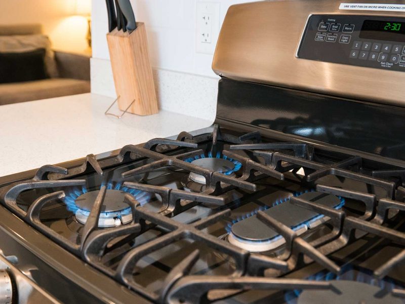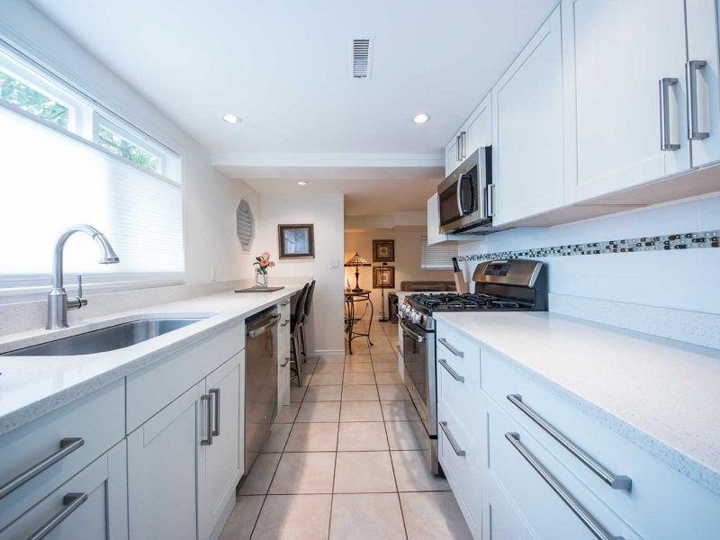 The brand new bright kitchen with granite counters is fully equipped for great meal making. It looks onto the front garden.