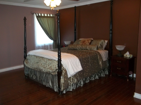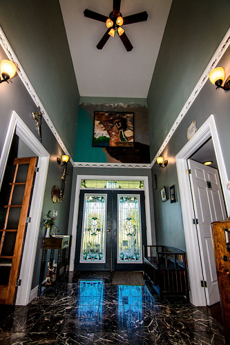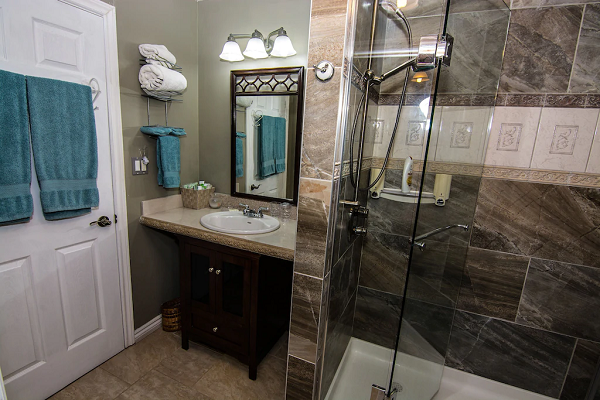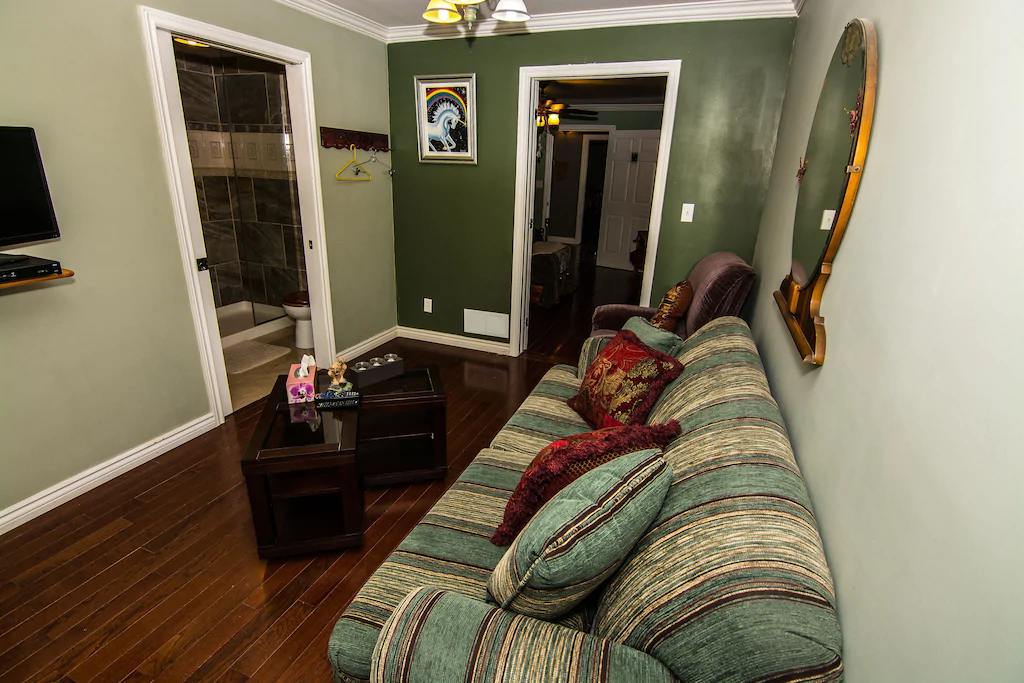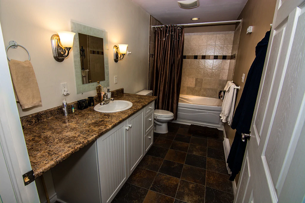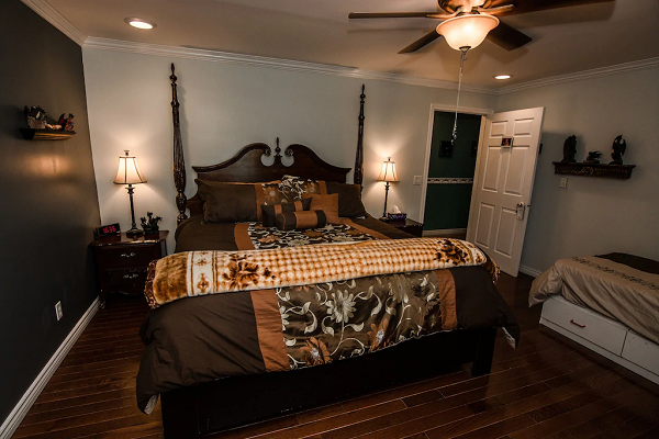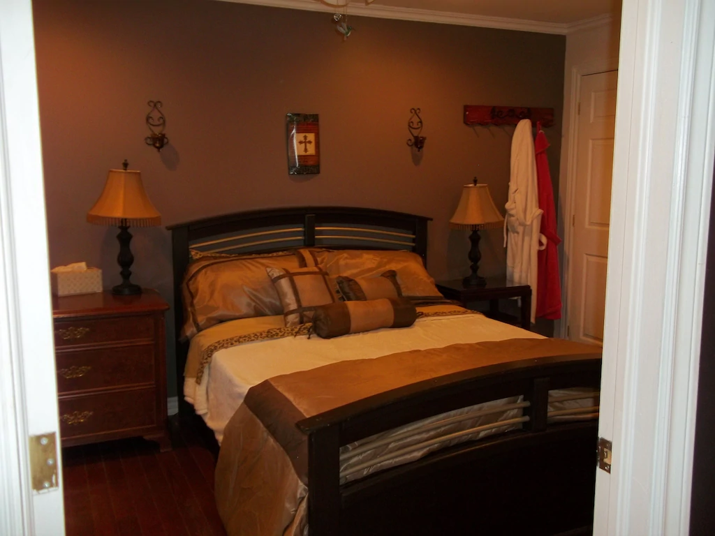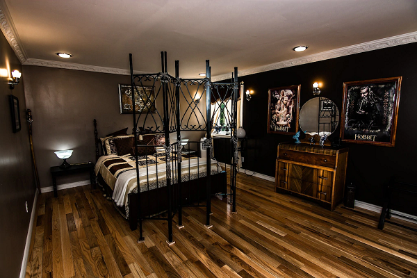 This home is perfect for large family gatherings or other group activities. There are 6 Suites, each with a bathroom. One suite has 3 bedrooms. Two suites have two bedrooms, 2 suites have one bedroom and a sitting room with a sofa bed that can sleep 2 persons. One suite has 2 beds (one king, one queen) in the same room. We also have an extra air bed available if needed. The Dragons Lair suite is actually 2 side by side bedrooms that share a bathroom from the hallway. Two other Suites (Knights Rest Suite and Reeves Realm Suite) share a private bathroom that is located between the bedrooms. There are a total of 7 full bathrooms and 1 powder room. One bedroom suite (Valinor) is located on the main floor and is accessible without needing stairs. Most beds are queen size with memory foam toppers, there are also 3 king and 1 twin bed.