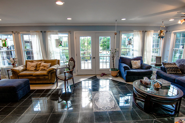 Our large, well stocked 500 sq ft kitchen is centrally located and is often the focus of gatherings and fun. It has an electric stove/oven as well as a gas cook top in a 10 ft long island , and includes two side by side refrigerators; one with an ice maker. In addition, there are 2 other large rooms, a sun room and sitting room, just off the kitchen, and a games room upstairs for our guests to enjoy.